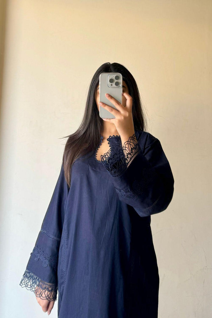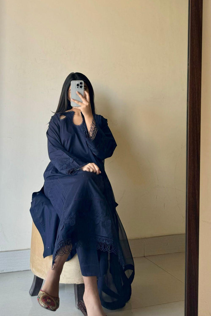 Enhance your wardrobe with this graceful 3-piece cotton suit, adorned with fine lace detailing and stylish sleeves.