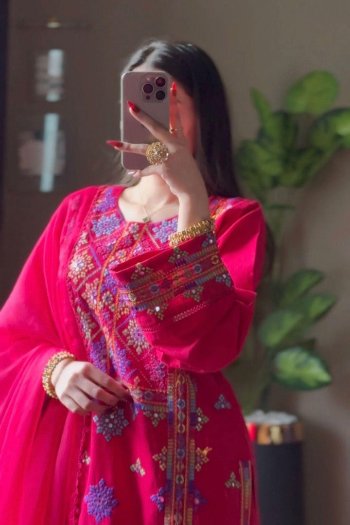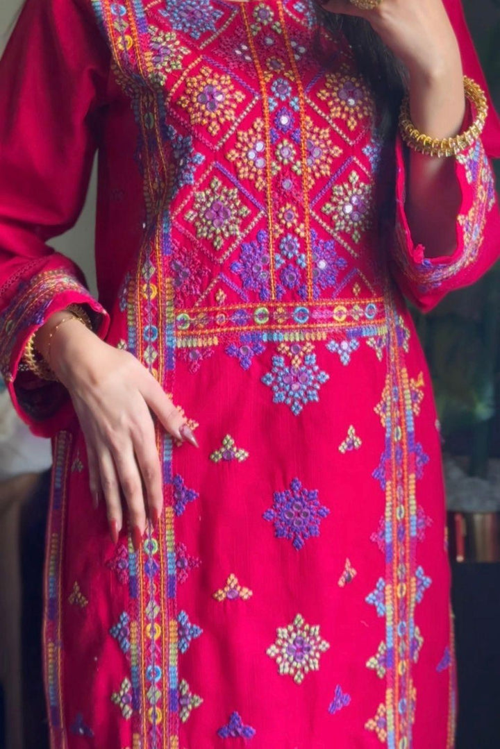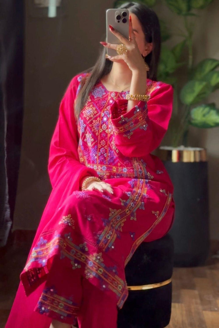 A stunning magenta 3-piece suit beautifully detailed with multicolor embroidery and mirror work.