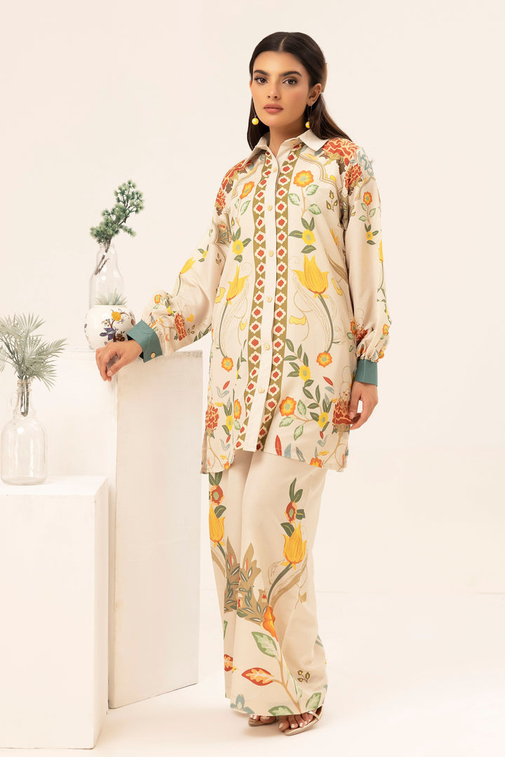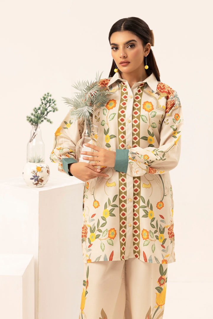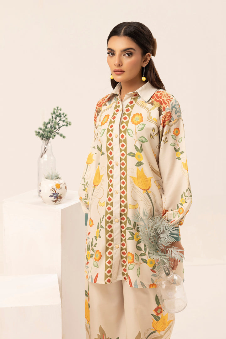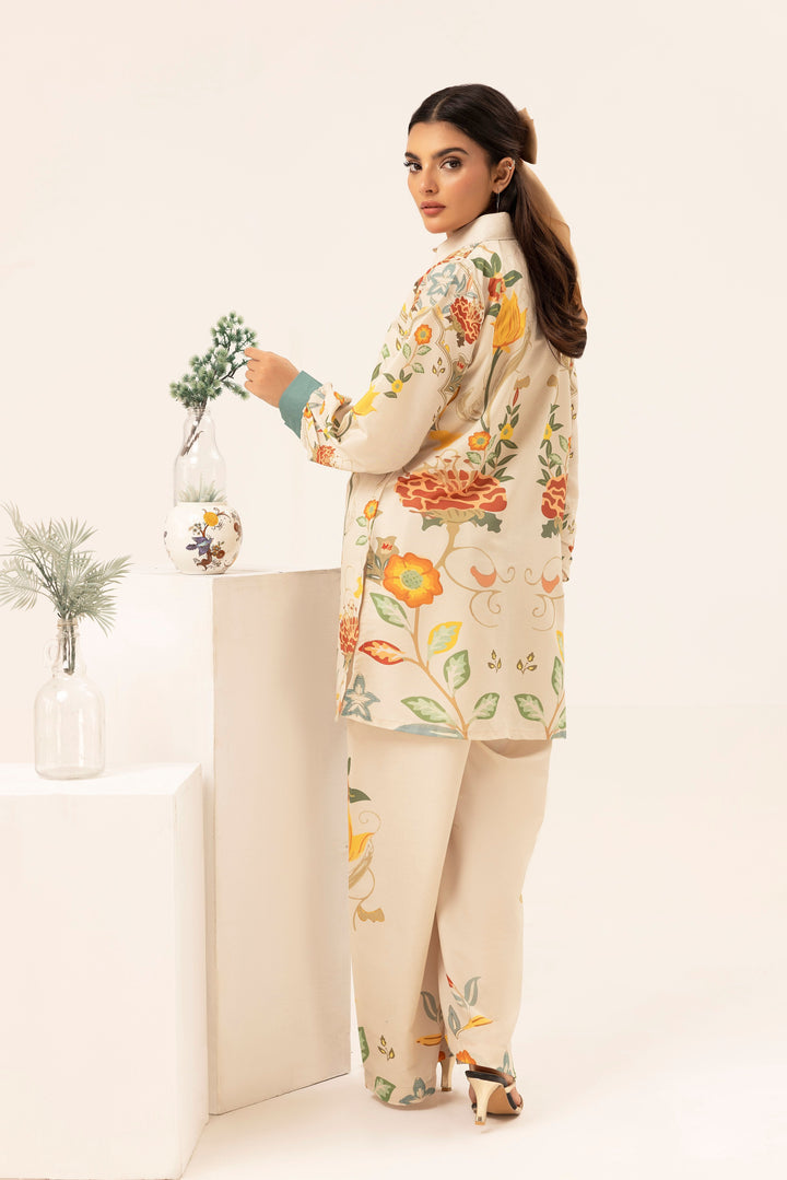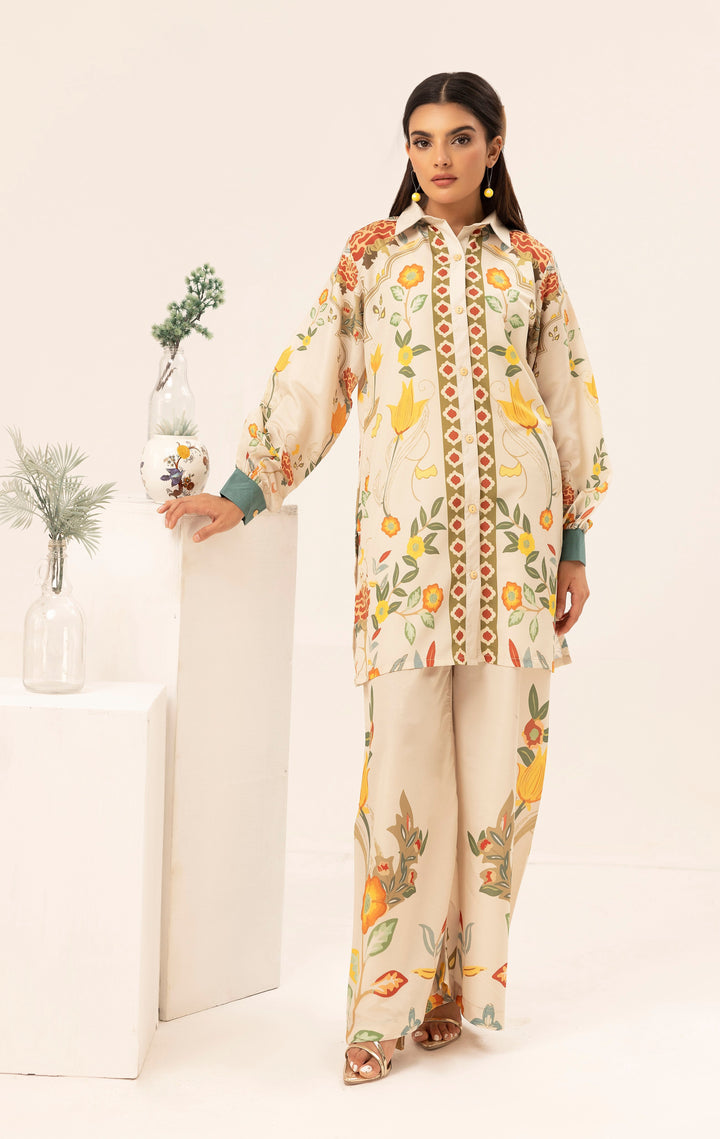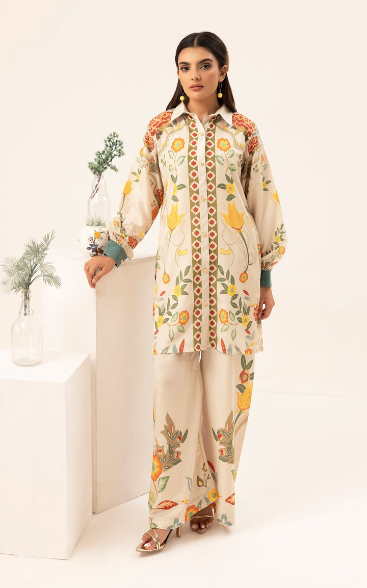 Indulge in the beauty of nature with Garden Bloom, a 2-piece stitched ensemble that radiates warmth and sophistication. The soft cream base is adorned with intricate floral motifs in vibrant yellow, orange, and earthy green tones, creating an effortlessly graceful look. The structured collar and delicate border details add a refined touch, making this outfit perfect for both casual elegance and semi-formal gatherings.