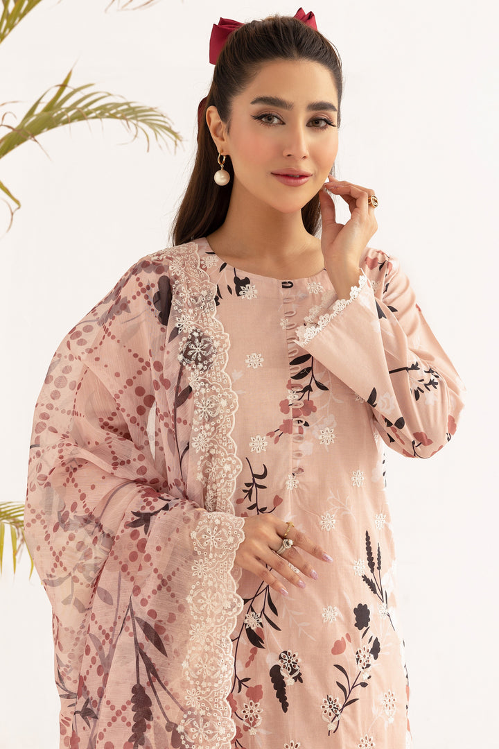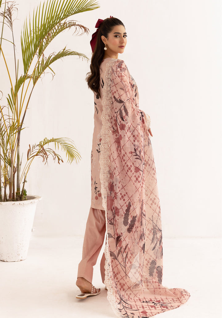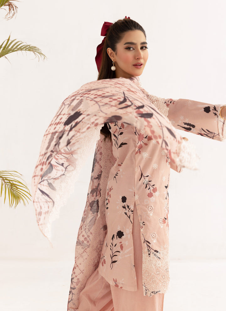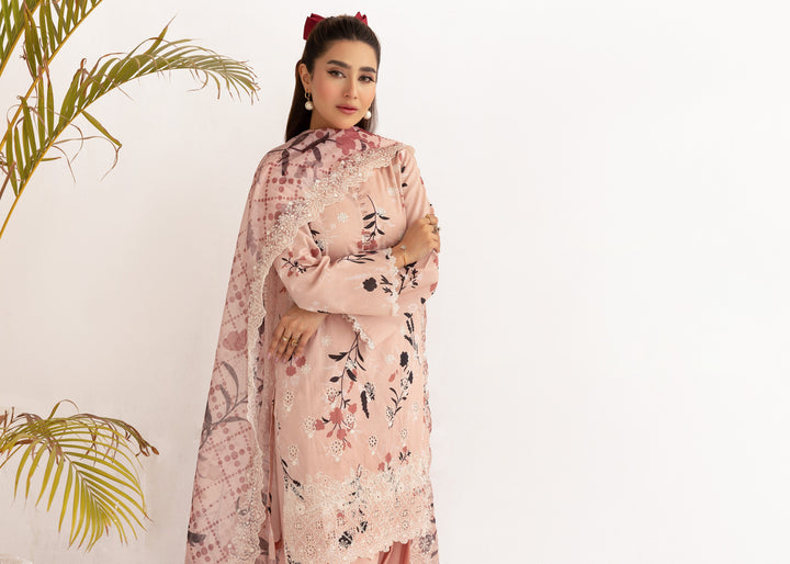 Embodying the gentle blush of dawn, this ensemble is a tribute to timeless grace and poetic femininity. The digital printed schiffli embroidered Lawn shirt is adorned with delicate floral motifs in soft rose and ivory, each stitch reminiscent of dew-kissed petals. Intricate schiffli embroidered borders grace the hem and sleeves, while dainty lace trims add a whisper of refinement. The dyed cotton farshi shalwar flows elegantly, offering a regal silhouette that nods to tradition yet feels effortlessly modern. Completing the look, the digital printed chiffon dupatta is embroidered at the edges, its airy drape and pastel patterns evoking the serenity of a blossoming garden. Every detail is thoughtfully crafted to create an aura of sophistication, comfort, and understated beauty.