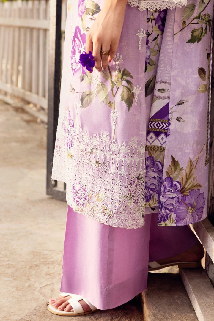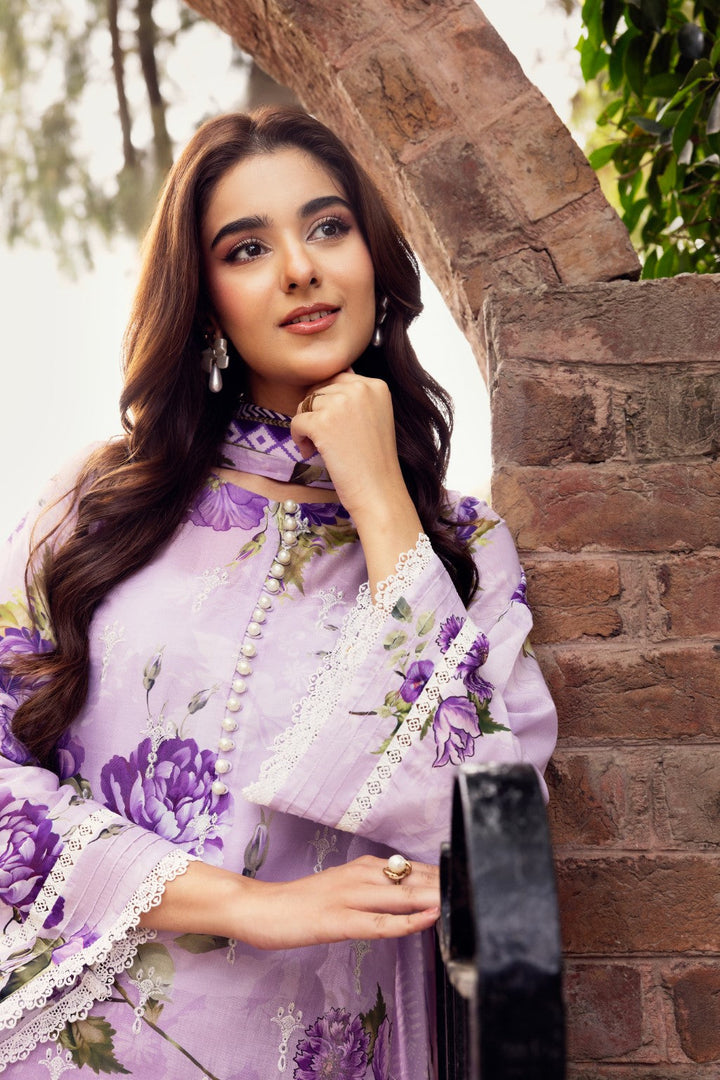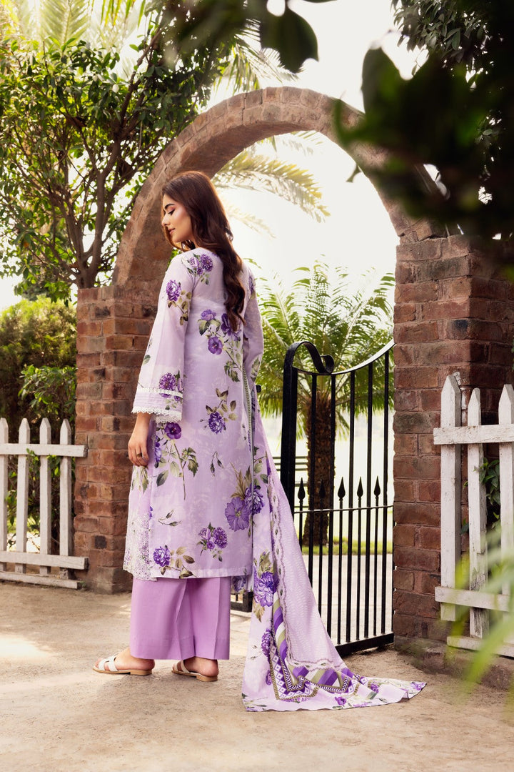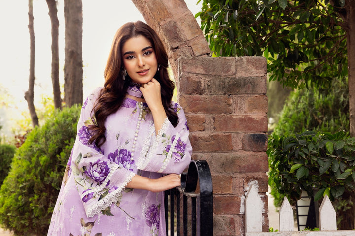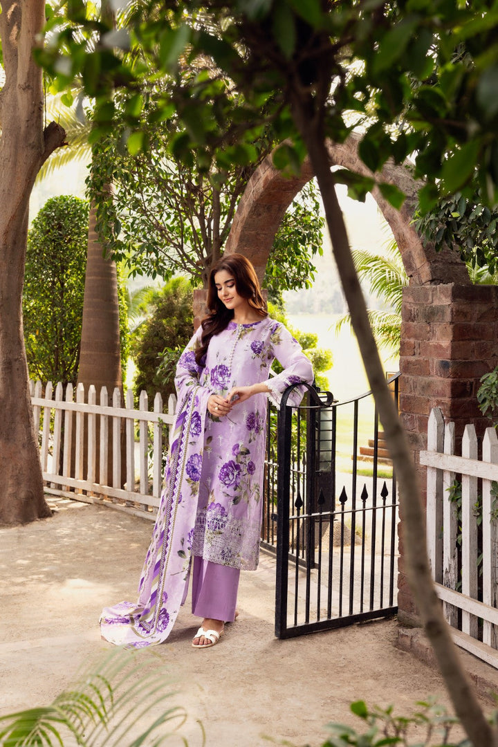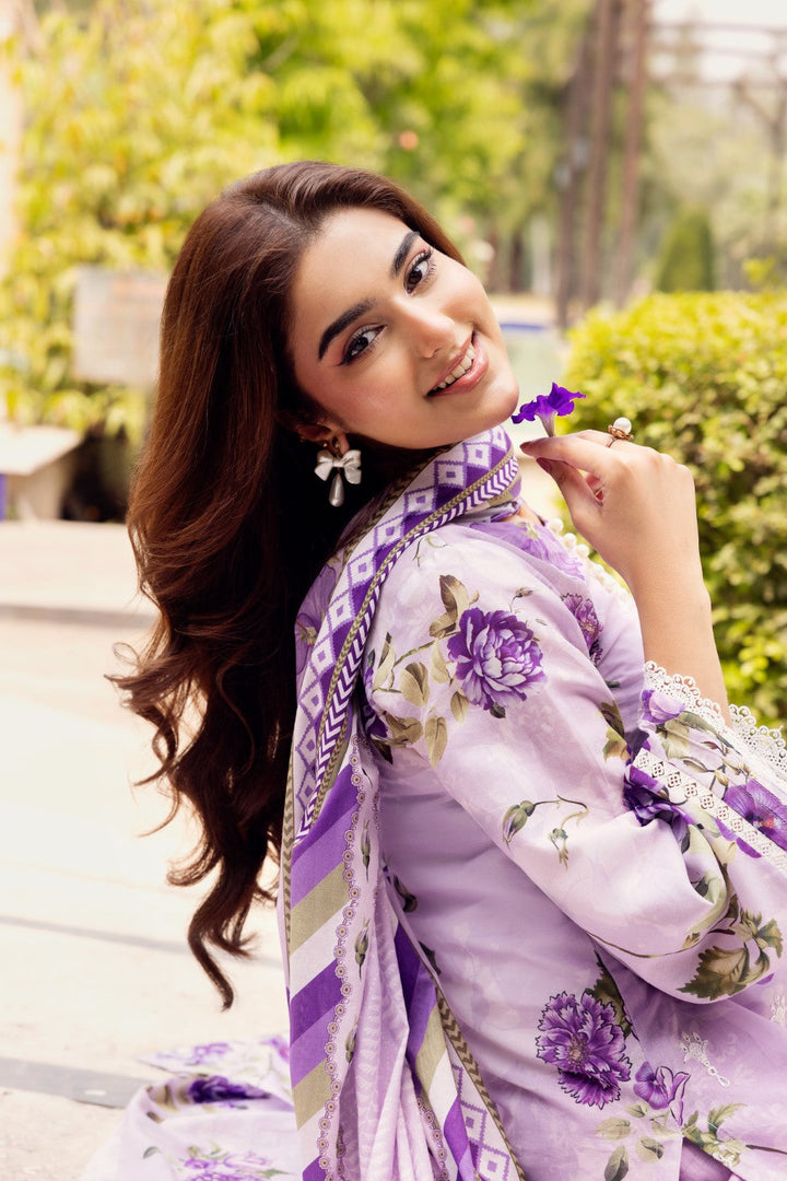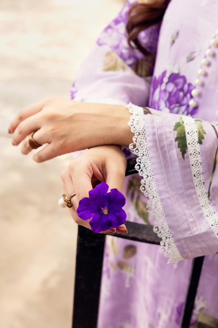 Unveil timeless charm with "Shameem," a beautifully stitched lilac ensemble that radiates elegance and freshness. The outfit features a soft lavender base adorned with intricate floral patterns in purple and white, creating a soothing and graceful look. The long, flowing shirt is paired with straight trousers in a matching shade, while the lightweight dupatta completes the ensemble with its delicate, airy feel. Perfect for garden parties, festive occasions, or daytime gatherings, "Shameem" offers a harmonious blend of comfort, sophistication, and poetic beauty—making it a standout addition to any wardrobe.