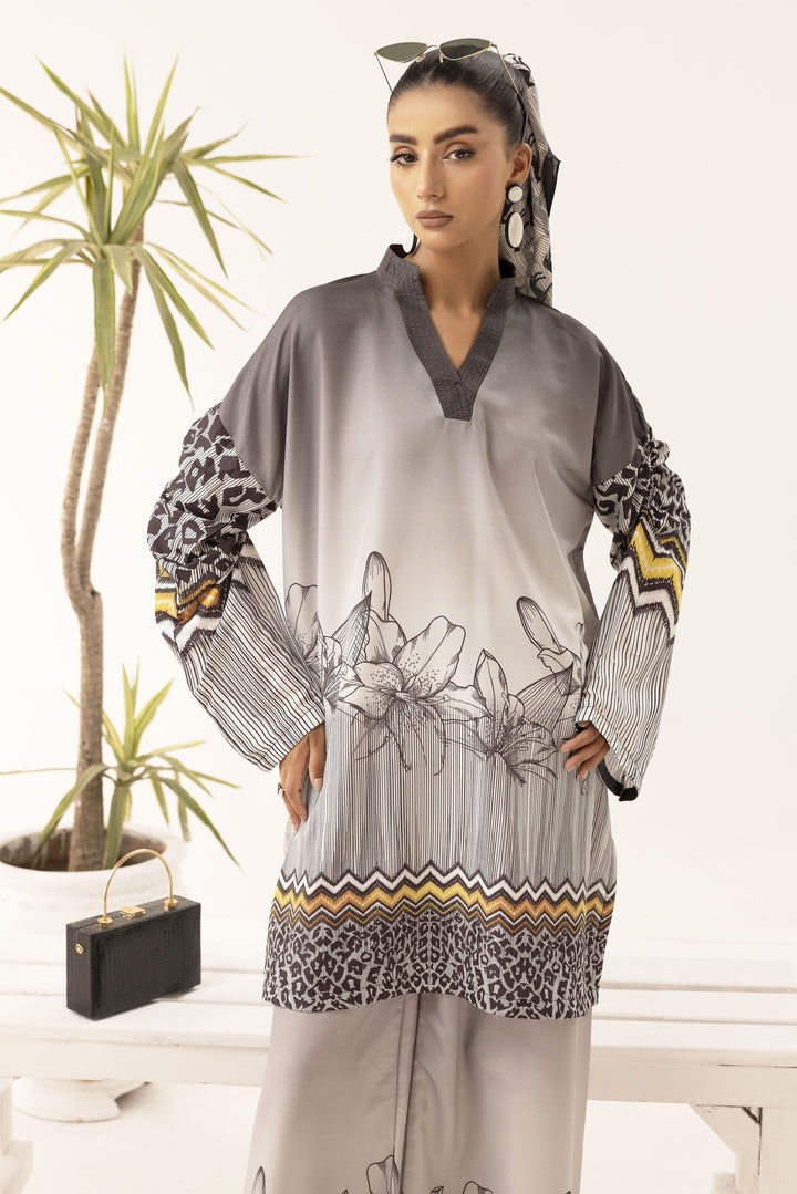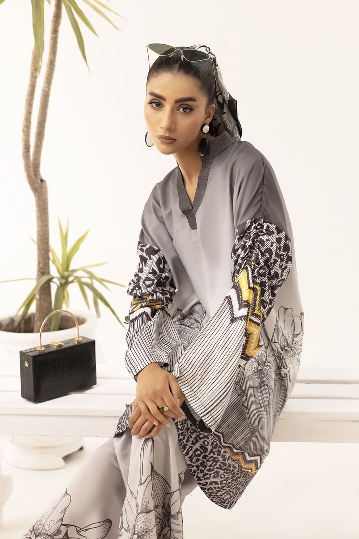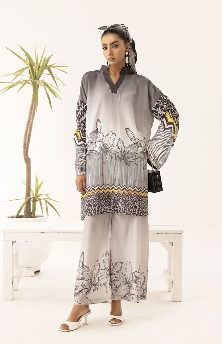 Step into effortless sophistication with Silver Mirage, a chic 2-piece stitched ensemble that exudes modern elegance. The gradient silver-gray base blends seamlessly with intricate patterns, bold animal prints, and geometric accents, creating a mesmerizing fusion of contemporary and classic styles. The delicate floral detailing on the trousers adds an artistic touch, while the flared sleeves bring an air of graceful movement.