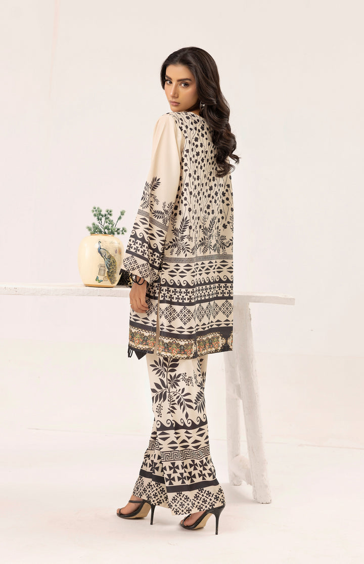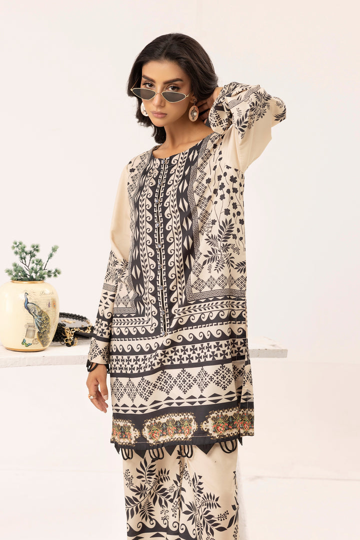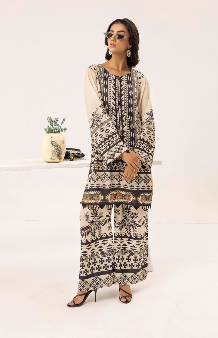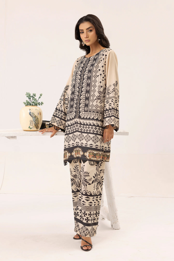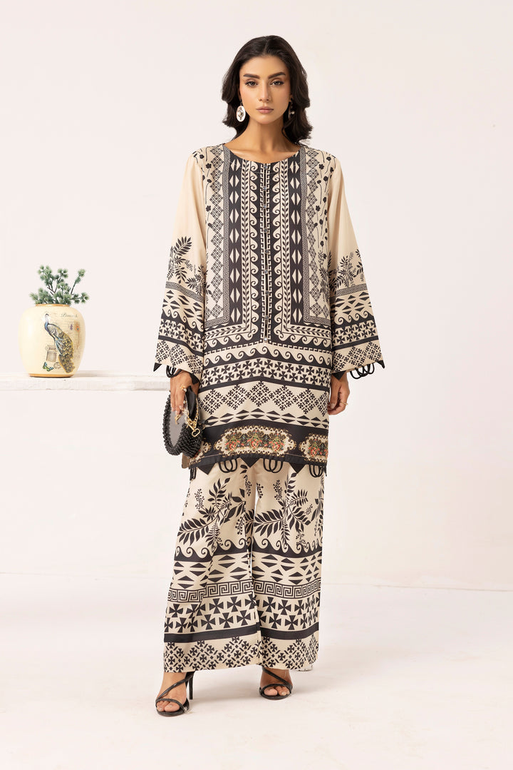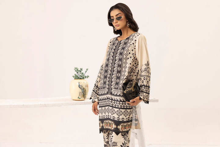 Elevate your style with Timeless Essence, a refined 2-piece stitched ensemble that embodies elegance with a modern touch. The soft beige base is adorned with intricate black ethnic motifs, geometric accents, and delicate floral patterns, creating a sophisticated monochrome contrast. The flowing silhouette and detailed borders add a touch of tradition, making this outfit perfect for any occasion. The ensemble is ideal for formal gatherings, casual outings, or office wear, and gives a polished and effortlessly chic look.