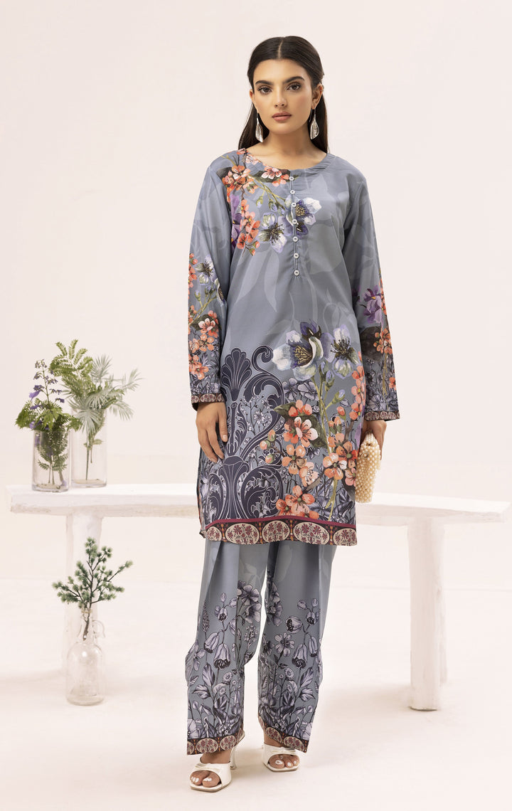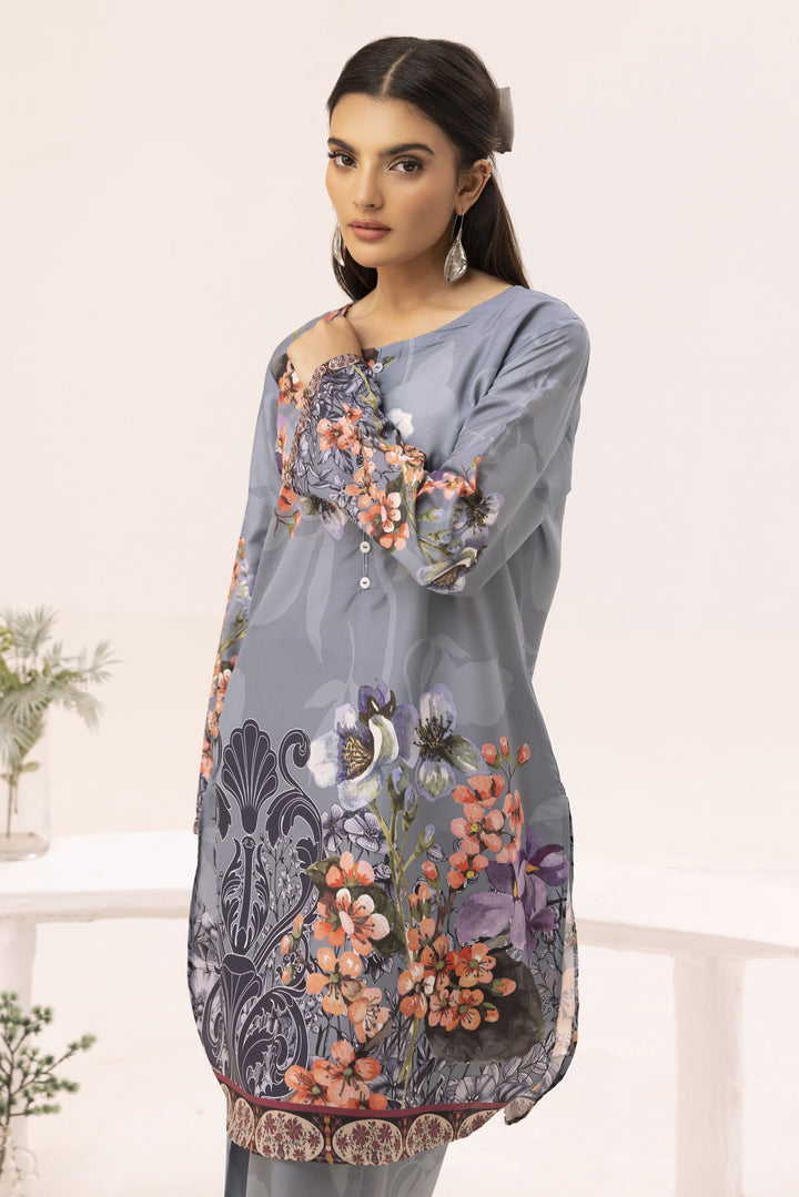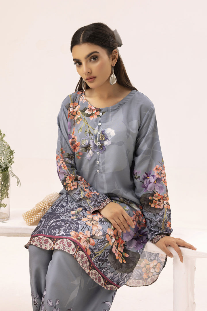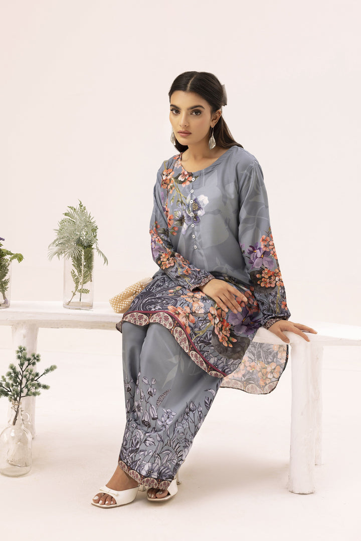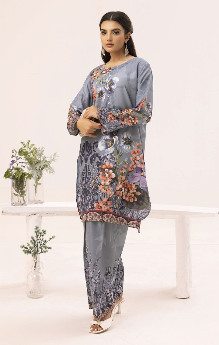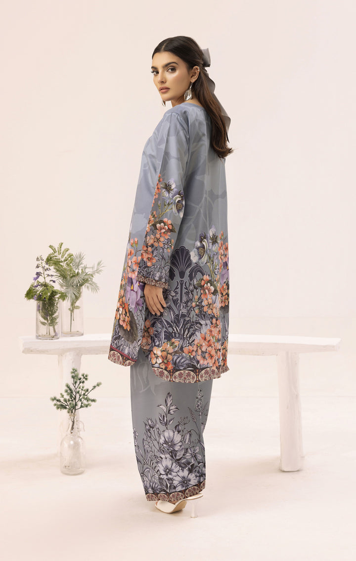 Elevate your wardrobe with Twilight Grace, a 2-piece stitched ensemble designed for effortless elegance. The steel blue kurta is adorned with a captivating blend of floral and ornamental prints, creating a refined yet modern aesthetic. The artistic sleeve design and intricate hem detailing add a statement touch, making it ideal for both formal and casual occasions.